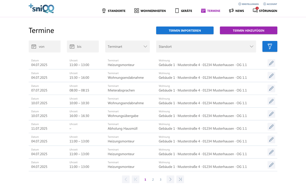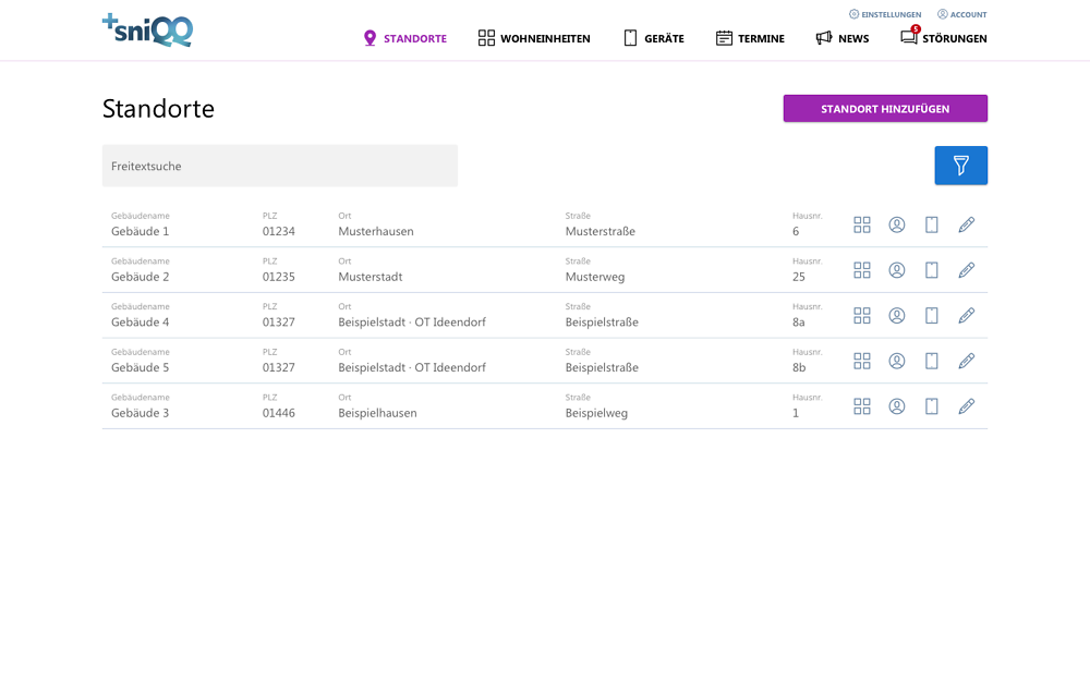 In der Ansicht "Standorte" können Vermieter mit nur wenigen Klicks eine neue Immobilie anlegen. Diesen werden unter "Wohneinheiten" die Wohnungen angelegt und zugeordnet. Dabei kann der Titel individuell – nach der bisher verwendeten Bezeichnung – vergeben werden. Aktuelle Mieter samt Mietdauer werden erfasst und mit der Wohneinheit verknüpft. In kürzester Zeit sind alle grundlegenden Daten hinterlegt und in einer übersichtlichen Ansicht filter- und bearbeitbar.