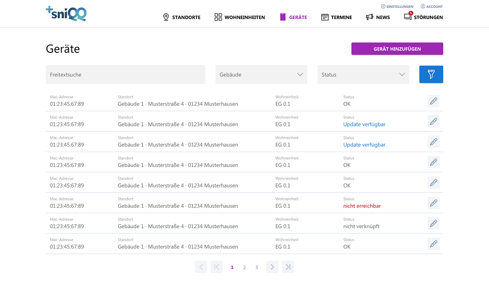 Das Hinzufügen und Verknüpfen der Geräte an die Wohneinheit geschieht mit wenigen Klicks. In einer übersichtlichen Liste können diese verwaltet, gefiltert und der Status überwacht werden.