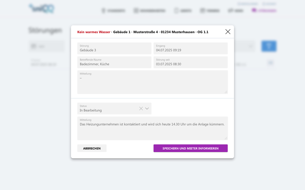 Die vom Mieter gemeldeten Störungen gehen zentral ein und können in einer übersichtlichen Liste bearbeitet werden. Mit Statusmeldungen halten Sie die Mieter auf dem Laufenden oder fragen spezifisch nach. Das macht die Kommunikation effizient und beschleunigt die Problemlösung.